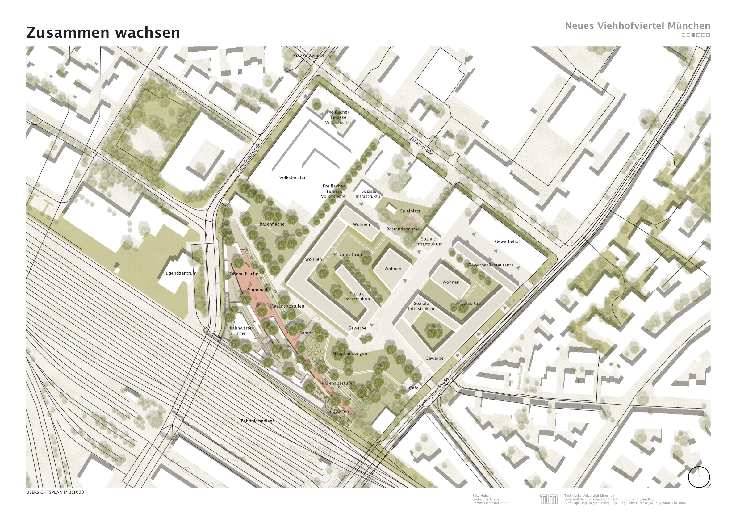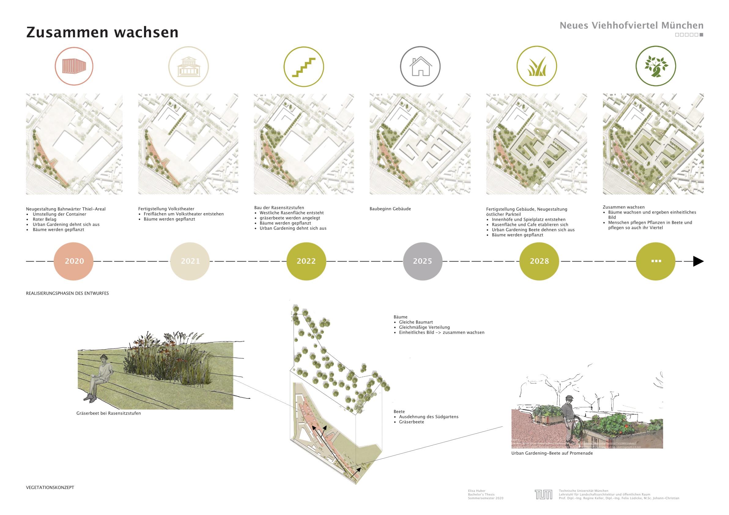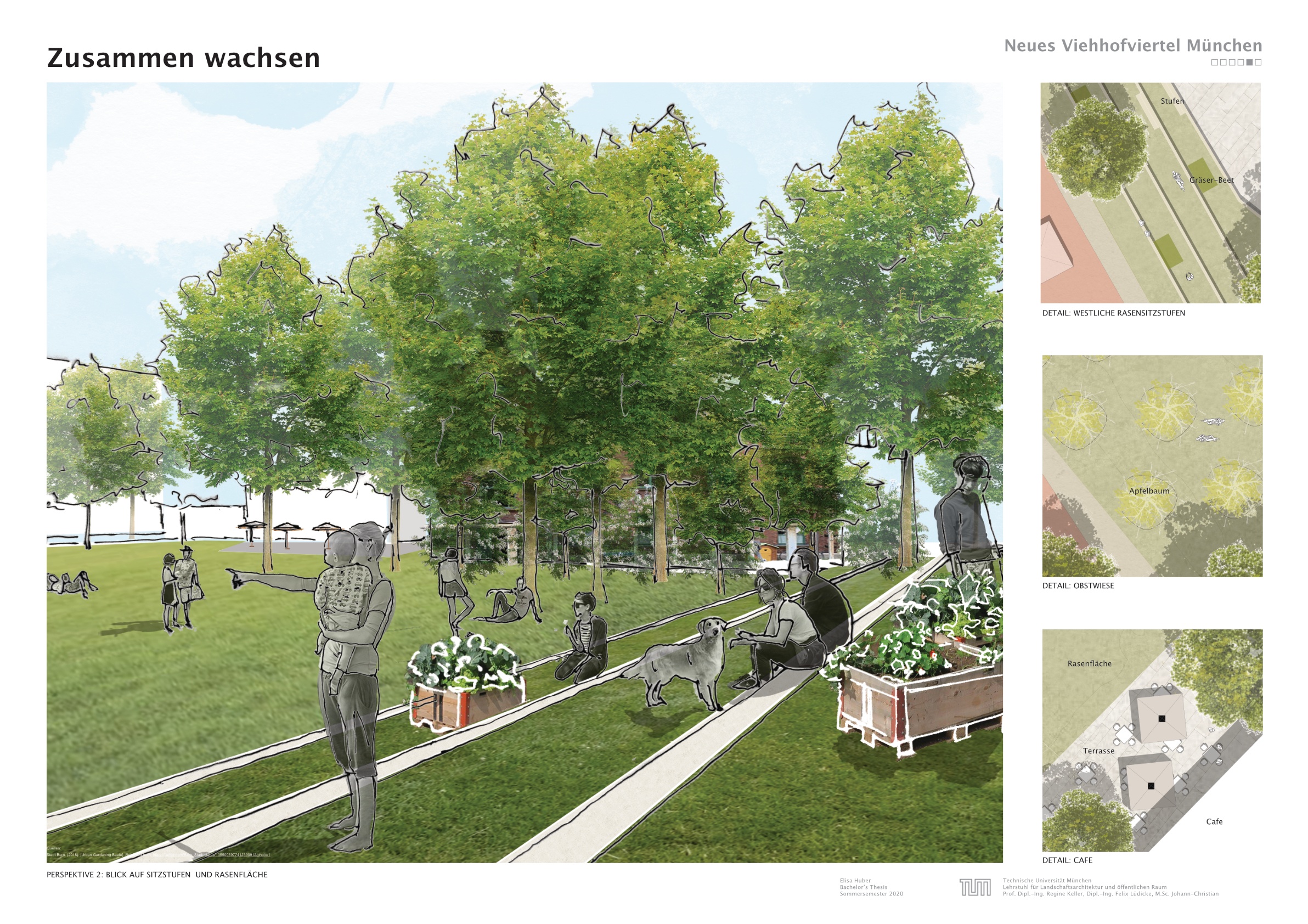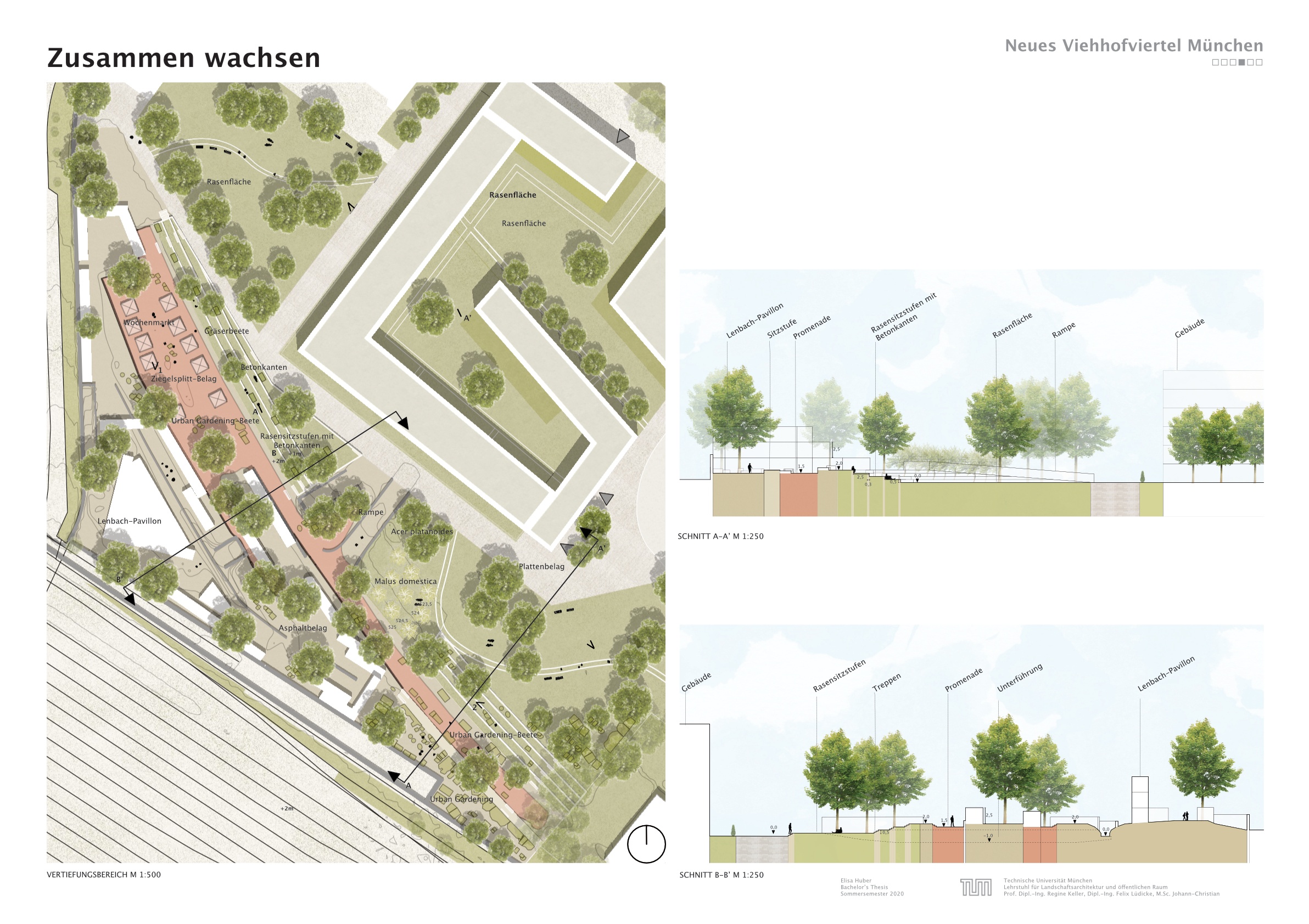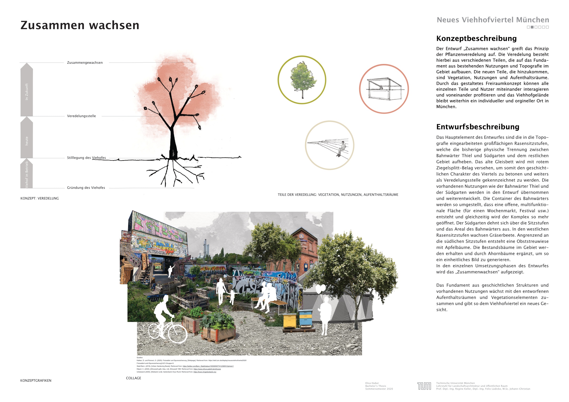 Der Entwurf „Zusammen wachsen“ greift das Prinzip der Pflanzenveredelung auf. Die Veredelung besteht hierbei aus verschiedenen Teilen, die auf das Fundament aus bestehenden Nutzungen und Topografie im Gebiet aufbauen. Die neuen Teile, die hinzukommen, sind Vegetation, Nutzungen und Aufenthaltsräume. Durch das gestaltetes Freiraumkonzept können alle einzelnen Teile und Nutzer miteinander interagieren und voneinander profitieren und das Viehhofgelände bleibt weiterhin ein individueller und orgineller Ort in München.