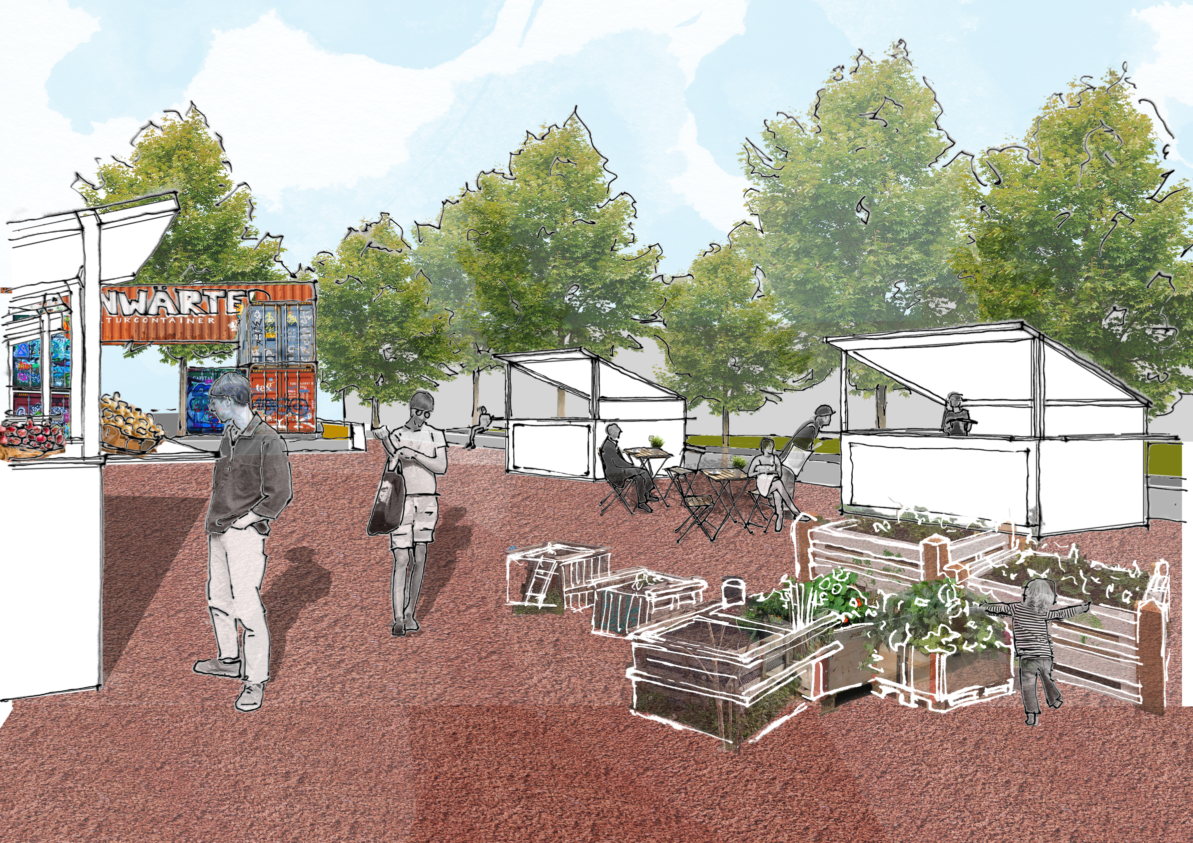 Das Hauptelement des Entwurfes sind die in die Topografie eingearbeiteten großflächigen Rasensitzstufen, welche die bisherige physische Trennung zwischen Bahnwärter Thiel und Südgarten und dem restlichen Gebiet aufheben. Das alte Gleisbett wird mit rotem Ziegelsplitt-Belag versehen, um somit den geschichtlichen Charakter des Viertels zu betonen und weiters als Veredelungsstelle gekennzeichnet zu werden. Die vorhandenen Nutzungen wie der Bahnwärter Thiel und der Südgarten werden in den Entwurf übernommen und weiterentwickelt. Die Container des Bahnwärters werden so umgestellt, dass eine offene, multifunktionale Fläche (für einen Wochenmarkt, Festival usw.) entsteht und gleichzeitig wird der Komplex so mehr geöffnet. Der Südgarten dehnt sich über die Sitzstufen und das Areal des Bahnwärters aus. In den westlichen Rasensitzstufen wachsen Gräserbeete. Angrenzend an die südlichen Sitzstufen entsteht eine Obststreuwiese mit Apfelbäume. Die Bestandsbäume im Gebiet werden erhalten und durch Ahornbäume ergänzt, um so ein einheitliches Bild zu generieren.
