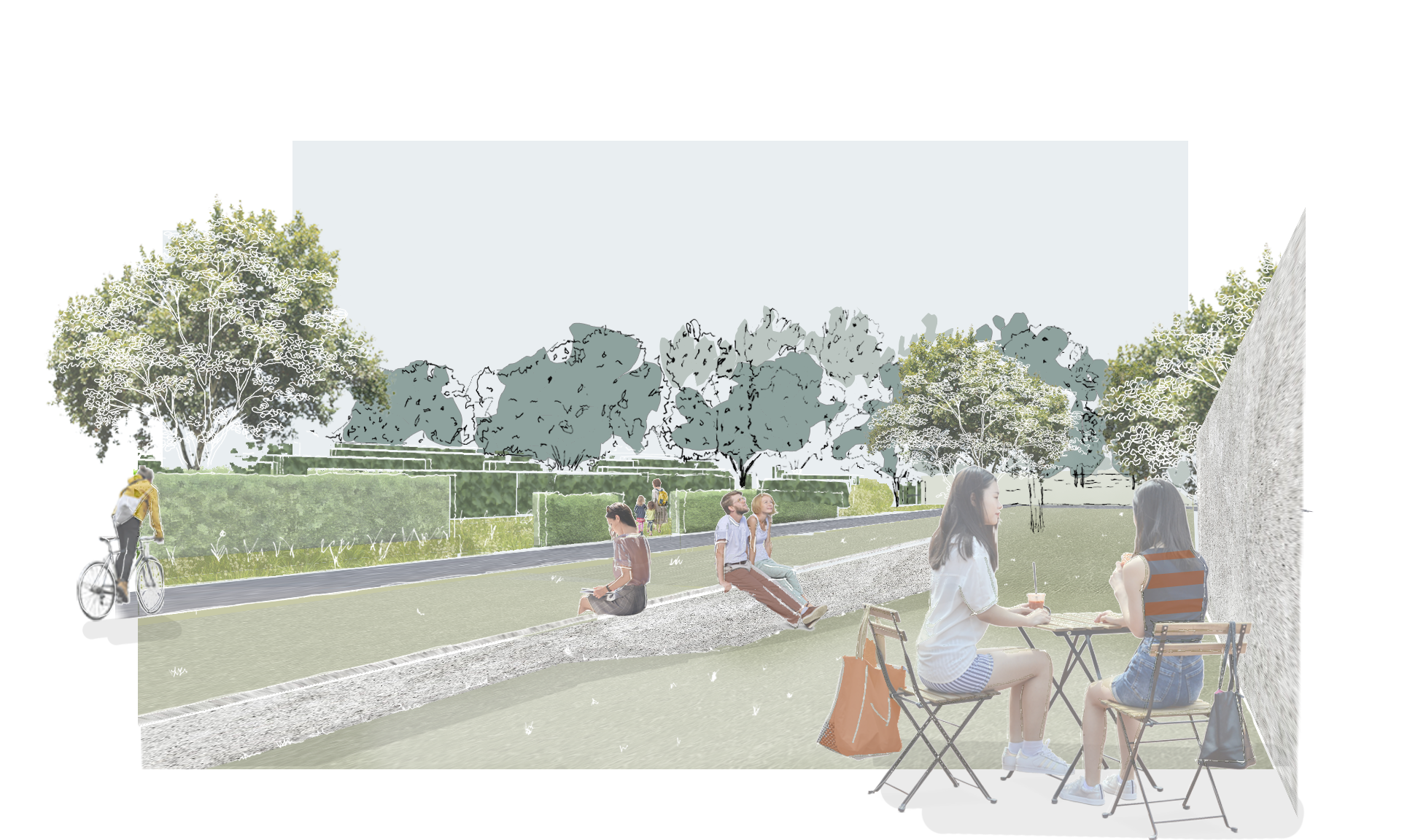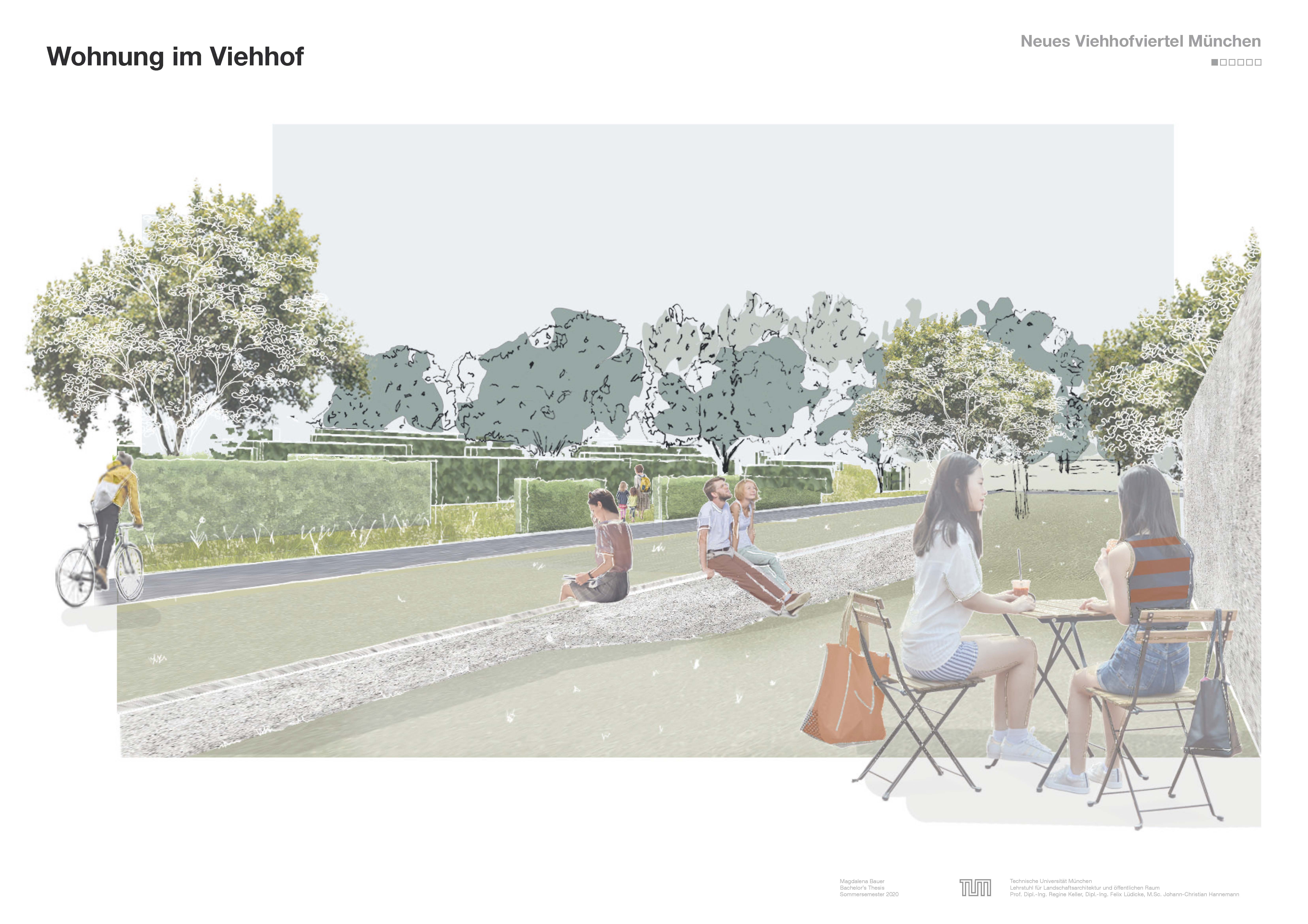 Der Vorplatz des Volkstheaters wird durch einen Baumhain aus stadtverträglichen Arten überdacht. Die Fläche ist, durch den Bodenbelag aus wassergebundener Wegedecke, gleichermaßen für Theatergäste in der Pause sowie für Veranstaltungen, wie z.B. Flohmärkte oder ähnliches, geeignet. Die Wiese der terrassierten Rampe im Westen des Areals lädt zum Verweilen ein und bietet Raum für Treffen mit Freunden. Betonierte Sitzstufen gliedern die Fläche ebenso wie Baumreihen, welche entgegen der Sitzstufen verlaufen. Im Süden des Gebietes ist eine freie Fläche zu finden, welche durch Kletterwände vom Weg abgegrenzt wird. Die Wiese ermöglicht aktive Nutzungen tagsüber aber auch das Viehhof Kino abends wieder aufleben zu lassen. Die Fläche des Bahnwärter Thiels wird verkleinert, jedoch bleiben die Nutzungen für Ateliers, Kantinen und Veranstaltungen in den Containern und U-Bahnwagons erhalten. Der östliche Teil der Rampe wird durch Heckenelemente und Obstbäume in kleine Rückzugsorte unterteilt. Die Blumenwiese mit Mähwegen unterstützt die gemütliche Atmosphäre. Der urban gardening Bereich ist an weiterhin im Südosten zu finden und wird lediglich durch mehr Anbaumöglichkeiten und Aufbewahrungselemente ergänzt.