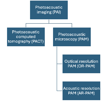 PAI can be subdivided into photoacoustic computed tomography (PACT) and photoacoustic microscopy (PAM) as shown in Figure 3. PAM can be further subdivided into optical resolution PAM (OR-PAM) and acoustic resolution PAM (AR-PAM). PACT uses wide-field optical illumination and parallel acoustic detection which enables it to achieve penetration depths of several centimeters. PAM uses a confocal optical illumination and acoustic detection which reduces the possible penetration depth but increases the possible axial-and lateral resolution.[2] In Figure 4 a possible configuration for PACT, OR-PAM and AR-PAM is shown.