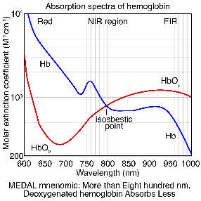 Figure 1: Wavelength dependency of oxygenated and deoxygenated hemoglobin. Oxy and Deoxy Hemoglobin Near-Infrared absorption spectra.svg, Cmglee, CC BY-SA 4.0 <https://creativecommons.org/licenses/by-sa/4.0>, via Wikimedia Commo, https://upload.wikimedia.org/wikipedia/commons/5/5c/Oxy_and_Deoxy_Hemoglobin_Near-Infrared_absorption_spectra.svg |