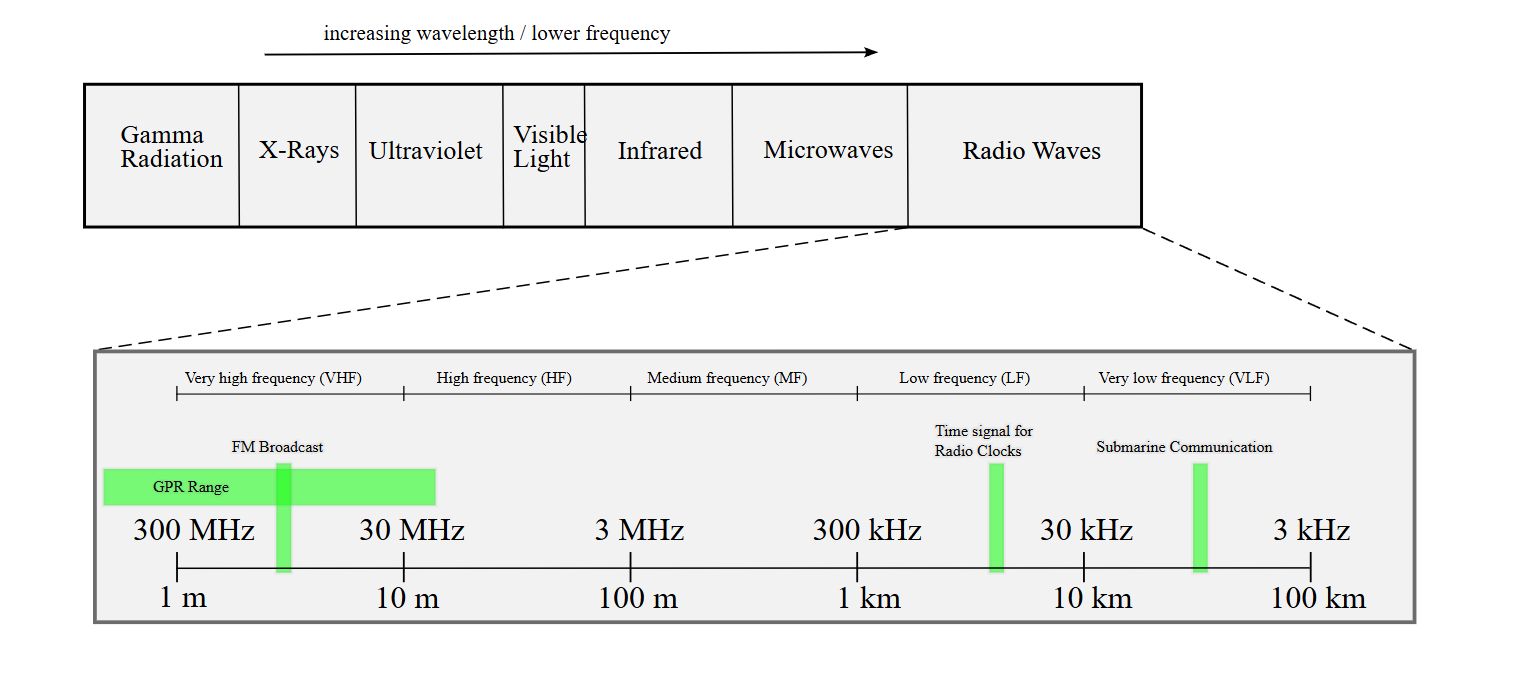 RADAR Systems primarily use electromagnetic radiation in the radio spectrum, comprising wavelengths from 1 m up to 100 km (frequencies from 300 MHz to 3 kHz). The propagation of electromagnetic waves follows the maxwell equations, which describe the interaction of electric and magnetic fields.[14]