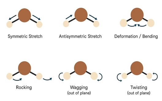 The bond of a molecule experiences various types of vibrations and rotations. This causes the atom not to be stationary and to fluctuate continuously. Vibrational motions are defined by stretching and bending modes. These movements are easily defined for diatomic or triatomic molecules. This is not the case with large molecules.