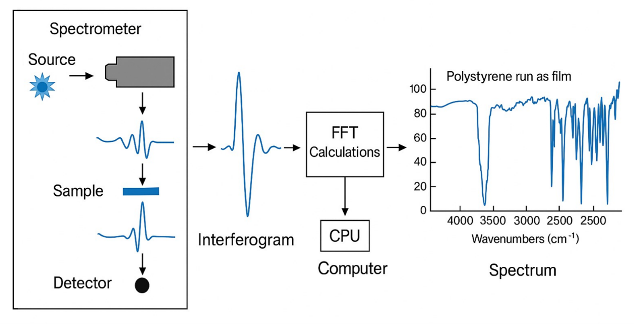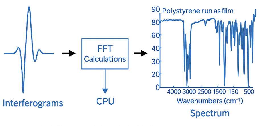Fourier Transform Infrared (FT-IR) spectrometry was developed to overcome the limitations (slow scanning process) encountered with dispersive instruments. A method for measuring all the infrared frequencies simultaneously, rather than individually, was needed. A solution that employed a simple optical device called an interferometer was developed. The interferometer produces a unique signal type with all the infrared frequencies “encoded” into it. This signal can be measured quickly, usually in one second or so. Thus, the time element per sample is reduced to a few seconds rather than several minutes. The resulting signal is called an interferogram, with the unique property that every data point (a function of the moving mirror position) makes up the signal and has information about every infrared frequency that comes from the source. This means that all frequencies are measured simultaneously as the interferogram is measured. Thus, the use of the interferometer results in high-speed measurements. Because the analyst requires a frequency spectrum (a plot of the intensity at each frequency) to identify the sample, the measured interferogram signal cannot be interpreted directly. A means of “decoding” the individual frequencies is required. This can be accomplished via a well-known mathematical technique called the Fourier transform. A computer performs this transformation, presenting the user with the desired spectral information for analysis [4].