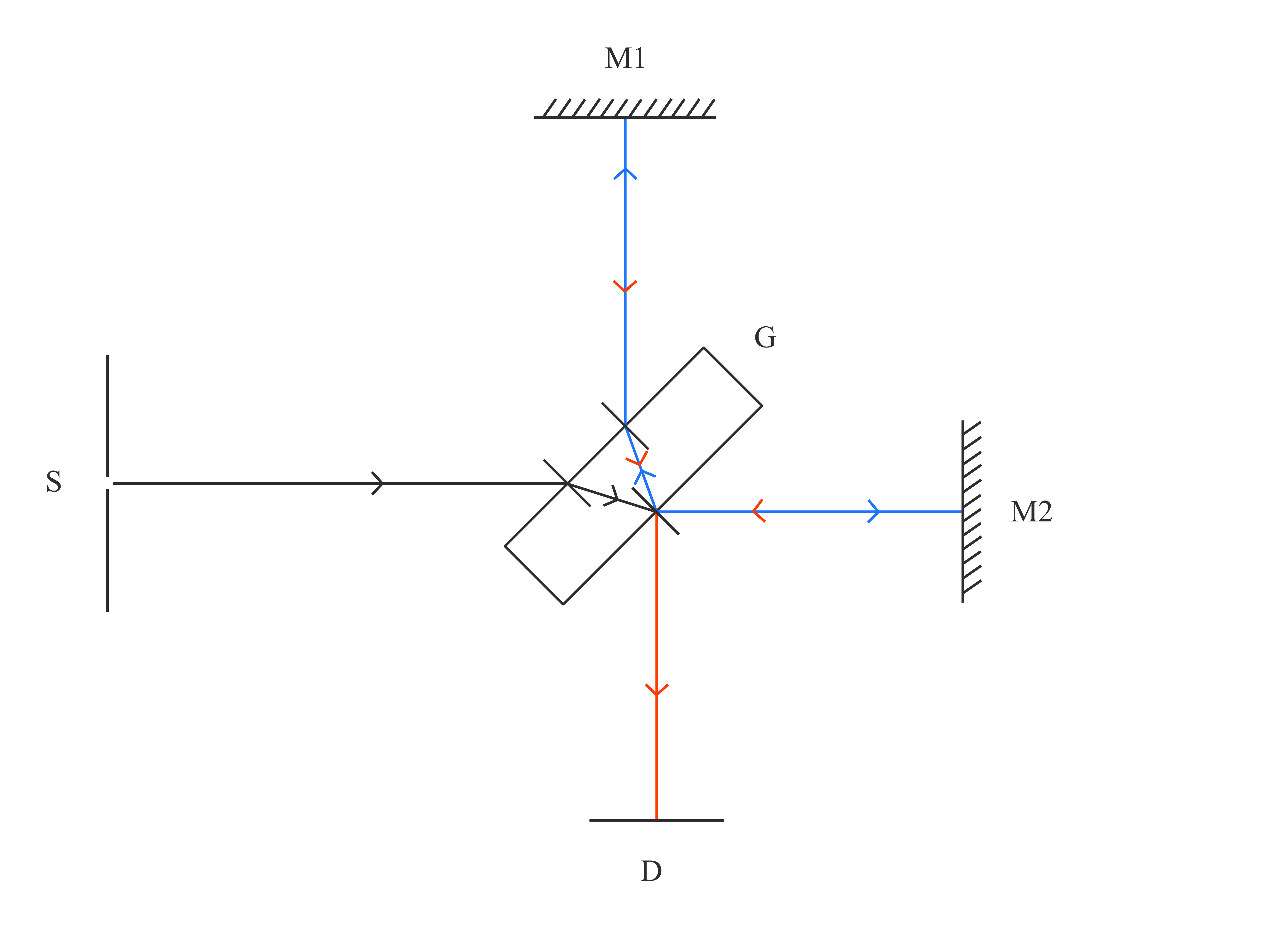 Invented more than one hundred years ago, the two-beam Michelson interferometer is still the heart of most modern Fourier transform infrared (FTIR) spectrometers. It consists of a fixed mirror, a moving mirror, and a beamsplitter, as illustrated in Figure 3. The beamsplitter is a laminate material that reflects and transmits light equally. The collimated infrared (IR) beam from the source (S) is partially transmitted to the moving mirror (M2) and partially reflected to the fixed mirror (M1) by the beamsplitter (G). The two IR beams are then reflected to the beamsplitter by the mirrors. The detector (D) then simultaneously sees the transmitted beam from the fixed mirror and the reflected beam from the moving mirror.