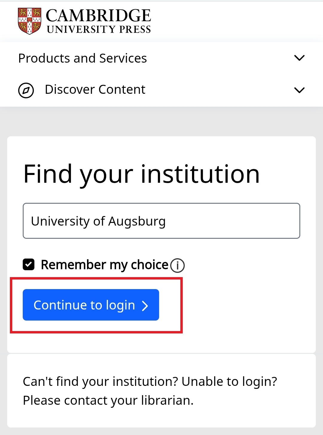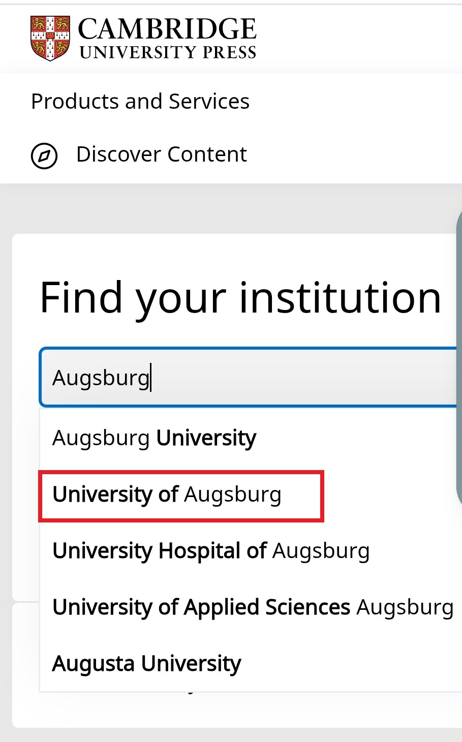 - Wählen Sie als Ihre Heimateinrichtung die "Universität Augsburg", "Universitätsbibliothek Augsburg" oder "University of Augsburg" aus – auch hier kann es Namensvarianten geben.