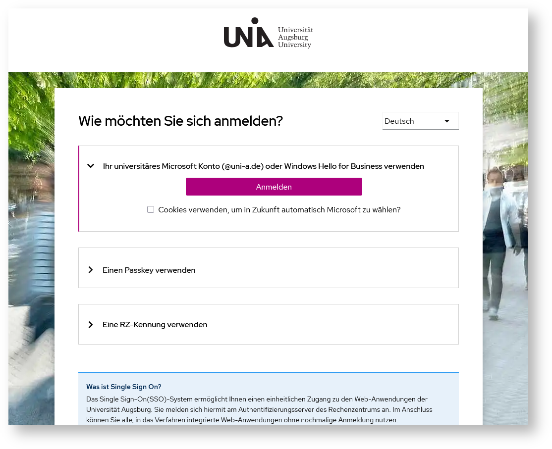 Das Rechenzentrum bietet mit Keycloak (OpenID Connect) einen modernen Authentifizierungsdienst mit Single Sign-On und Multi-Faktor-Anmeldung an. Dabei ist sowohl die föderierte Anmeldung über Microsoft OIDC (universitäres Microsoft Konto) als auch die Anmeldung via Passkey oder mit RZ-Kennung (und einem zweiten Faktor) möglich. An Dienstgeräten erfolgt besonders mit eingerichtetem Microsoft "Hello for Business" ein echtes Single Sign-On bei allen unterstützen Diensten.