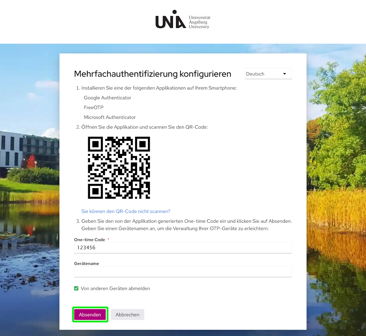 → Der Code ist immer nur 30 Sekunden gültig - achten Sie auf die Zeitanzeige (Balken unter dem Code) - "Absenden"