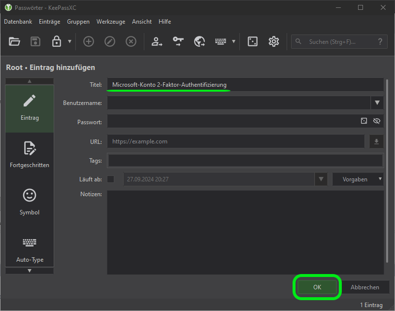 - Bestehende KeePassXC Datenbank öffnen und entsperren