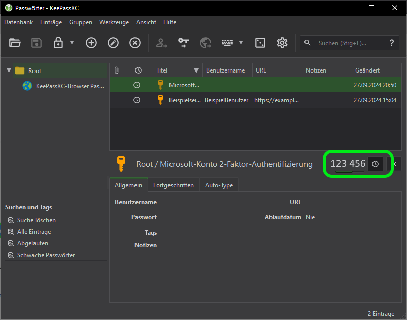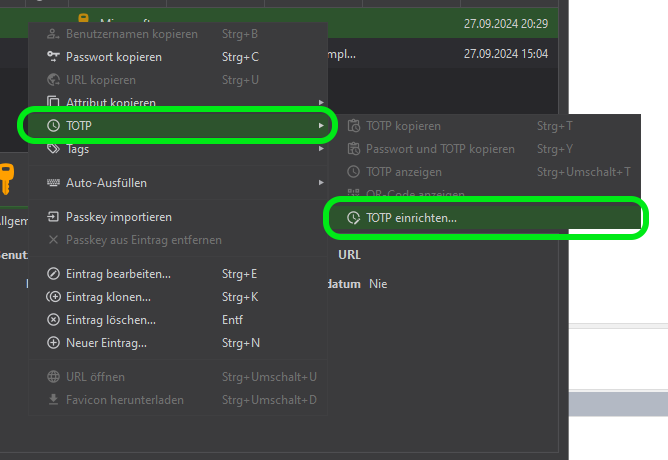 - Dieser Code kann in KeePassXC z.B. nach Auswahl des Eintrags über das Uhr-Symbol oder über das Kontextmenü eingeblendet werden.