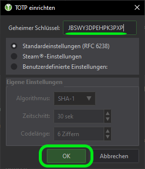 - Den zuvor kopierten geheimen Schlüssel in das Eingabefeld einfügen