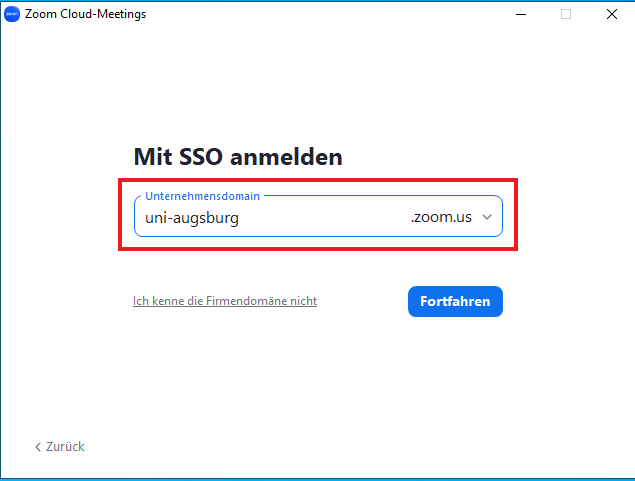 5. "uni-augsburg" (.zoom.us) angeben und "Fortfahren"