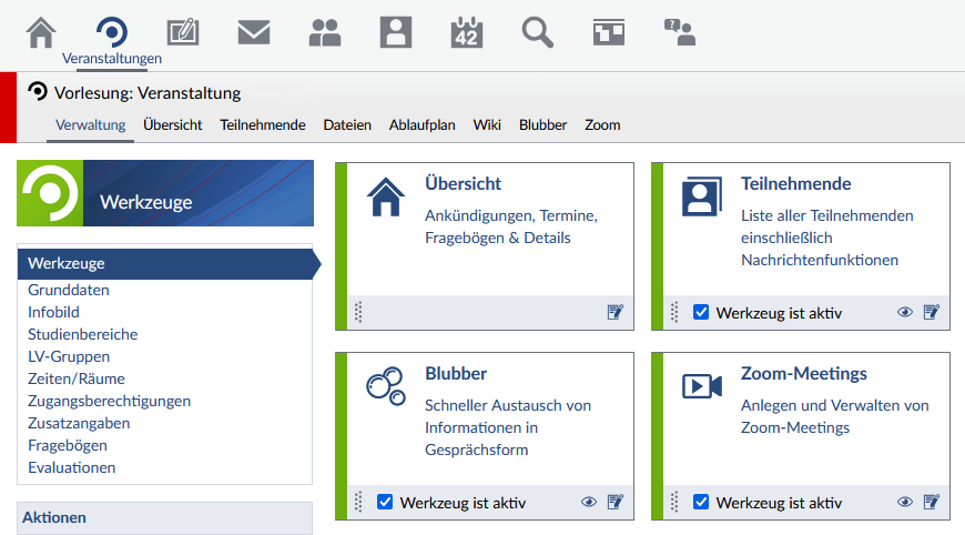 2. Im Reiter "Verwaltung" können Sie das Werkzeug "Zoom-Meetings" aktivieren, setzen Sie dazu ein Häkchen bei "Werkzeug ist inaktiv" in der entsprechenden Kachel