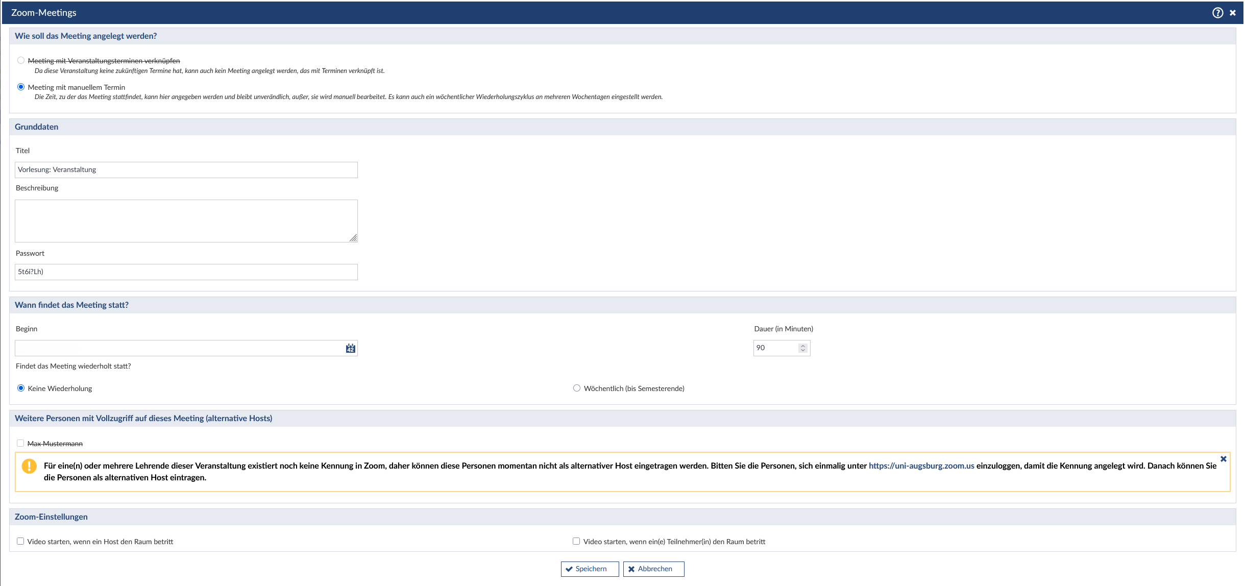 5. Wenn Sie ein "Meeting erstellen", setzen Sie bitte die gewünschten Einstellungen und speichern Sie im Anschluss