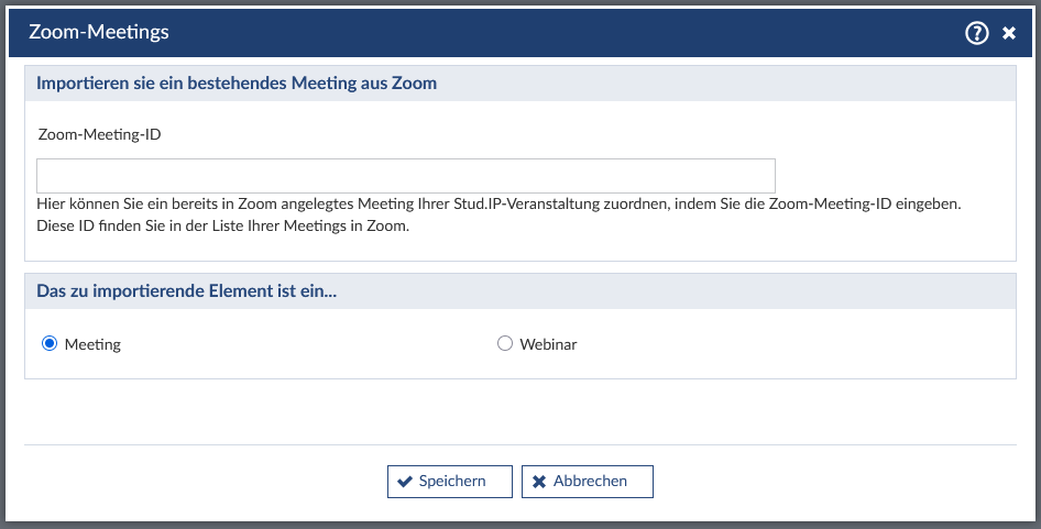 5. Wählen Sie "Meeting aus Zoom importieren", geben Sie die gewünschte Zoom-Meeting-ID ein und speichern Sie im Anschluss