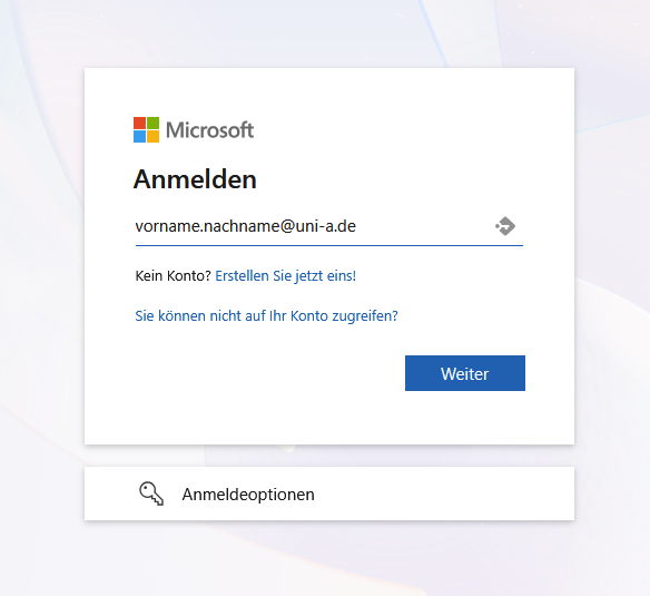 - Mit Microsoft-Account (i.d.R. vorname.nachname@uni-a.de) anmelden