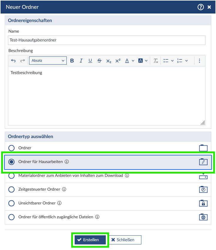 Vergeben Sie einen geeigneten Ordnernamen und wählen Sie den Ordnertyp „Ordner für Hausarbeiten“ aus und klicken Sie anschließend auf den Button „Erstellen“