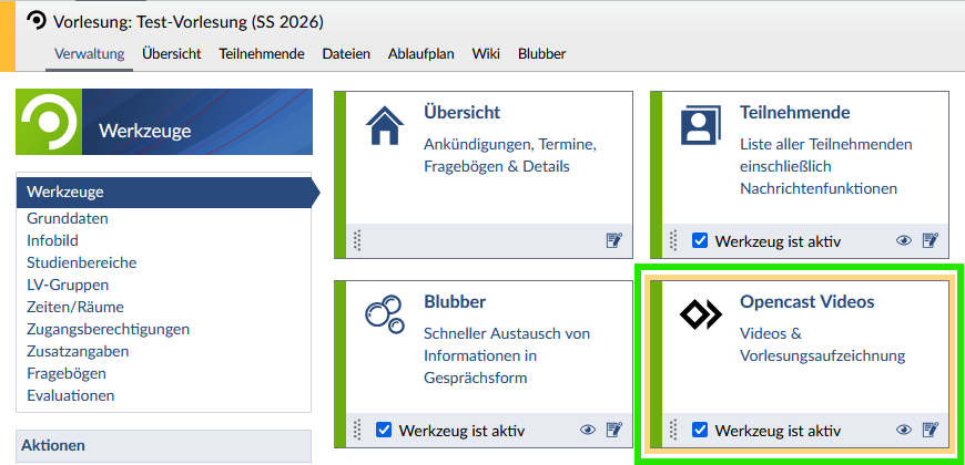 Aktivieren Sie das Plugin durch Setzen des Häkchens unter „Verwaltung“ >> „Werkzeuge“ >> „Opencast Videos“