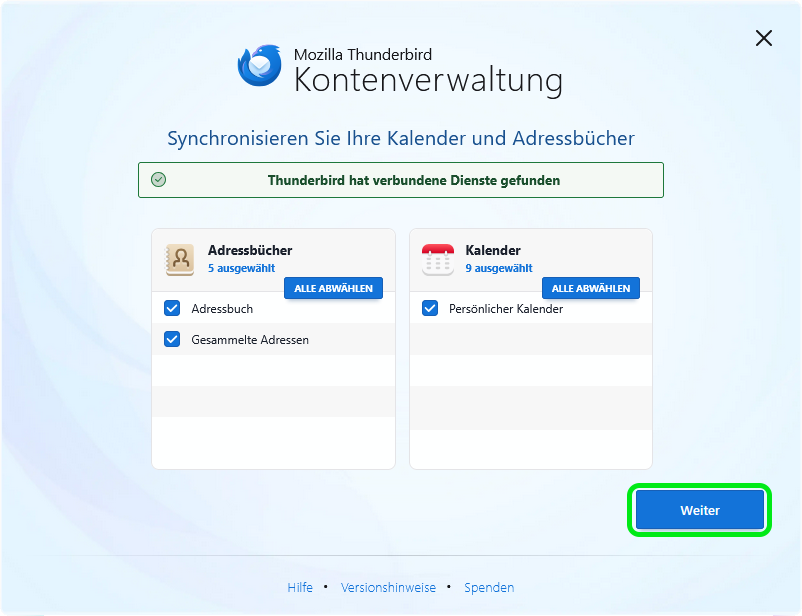 → Sollen keine Kalender & Adressbücher verbunden werden einfach die Option "Alle Abwählen" verwenden