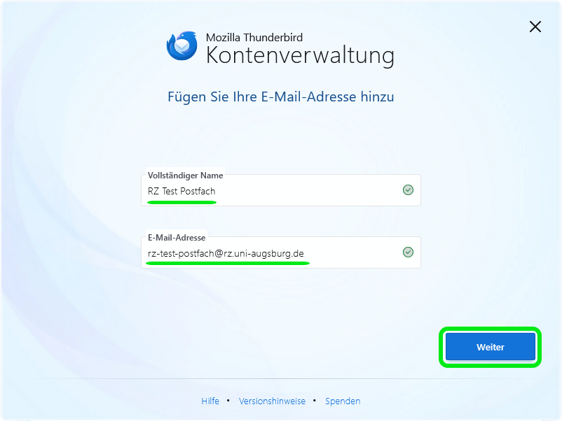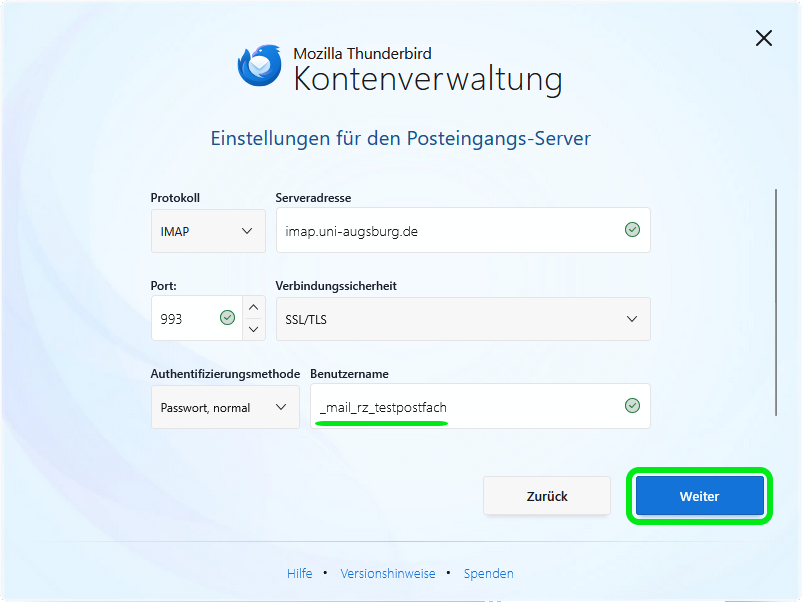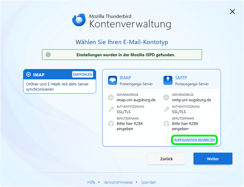 Für Mozilla Thunderbird steht für die Universität ein Konfigurationsserver bereit, dieser übermittelt automatisch alle notwendigen Parameter zur Einrichtung sodass Thunderbird. Allerdings wird dazu eine Verbindung mit dem Universitätsnetz benötigt z.B. via eduroam, im Büro am LAN oder von Zuhause/Außerhalb über unseren VPN