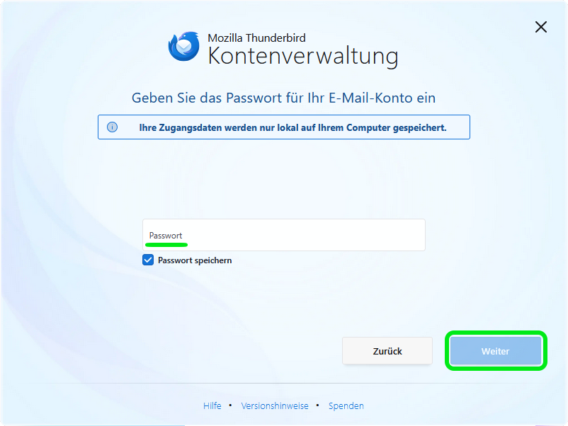 2. Im Assistenten den Anzeigenamen, die Funktionsmailadresse und das Passwort des Funktionspostfachs eingeben