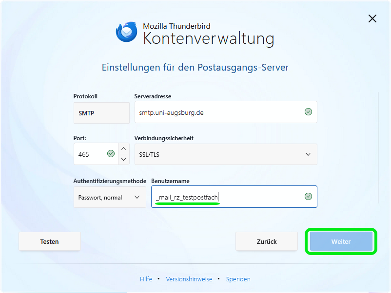 10. Im Feld "Benutzername" die Funktionskennung für den Postausgangs-Server eintragen (muss mit "_mail" beginnen)