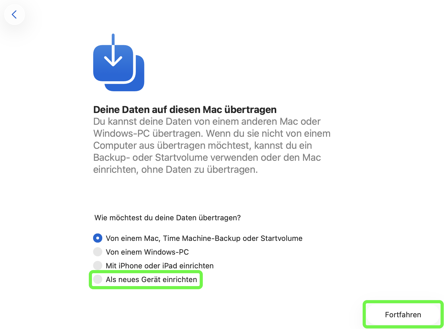 - Falls vorhanden, kann jetzt ein TimeMachine Backup eingespielt werden, ansonsten mit der Auswahl "Als neues Gerät einrichten" überspringen