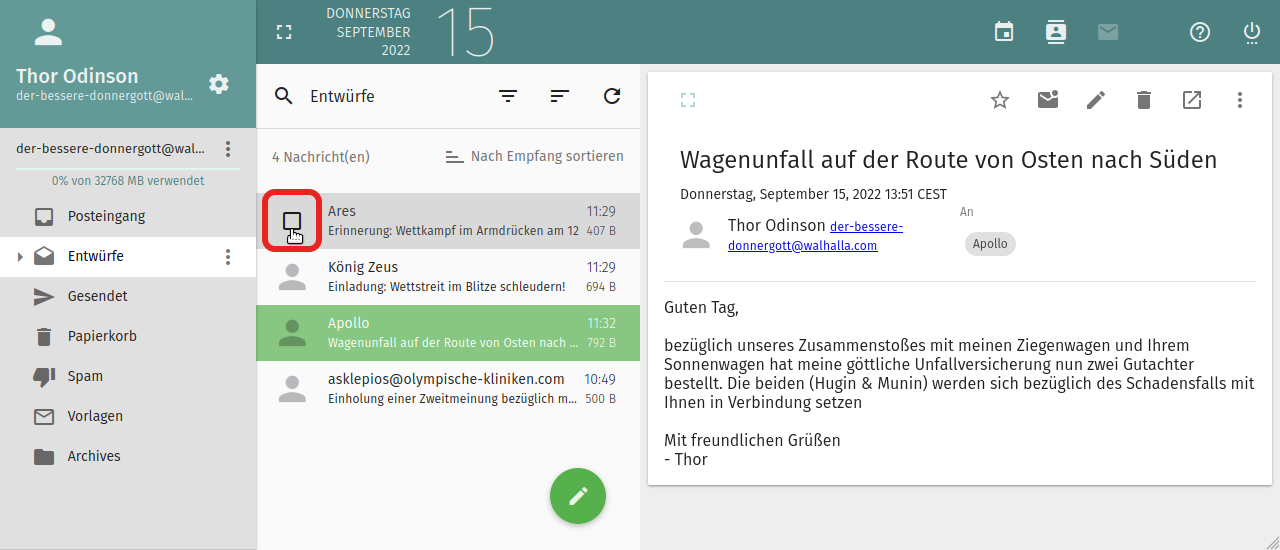 - Sobald das Kästchen aktiviert ist, erhalten automatisch alle Mails in der Liste ein Kontrollkästchen anstelle des Avatars