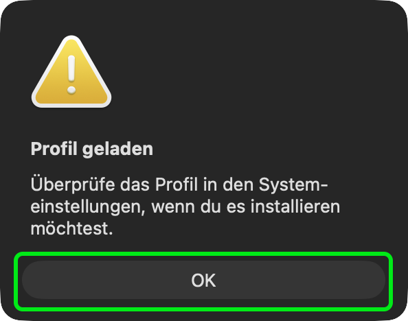 → Safari will run the file immediately after you granted permission to do so - Wait for the profile to load and hit "OK"