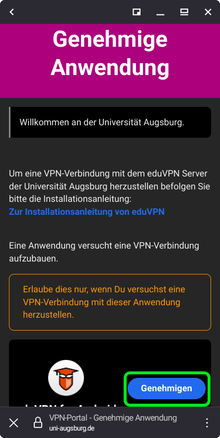 - Die URL eduvpn.rz.uni-augsburg.de eintragen und auswählen