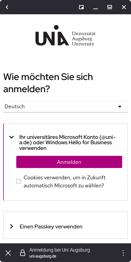 - Wahlweise mit dem universitären Microsoft Account, Passkey oder mit RZ-Kennung und zweitem Faktor anmelden