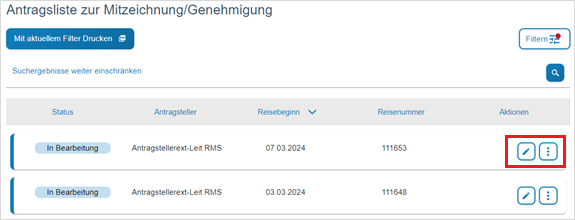 In der Liste sehen Sie alle Anträge, zu deren Mitzeichnung Sie aufgefordert wurden. Über die Schaltfläche bekommen Sie einen Gesamtüberblick über die beantragte Reise. Über die Schaltfläche können Sie Änderungen im Antrag vornehmen. (Hinweis: Nach erfolgter Mitzeichnung ist keine Bearbeitung mehr möglich) Hinweis: Falls der gesuchte Antrag nicht in der Liste angezeigt wird, öffnen Sie die Schaltfläche "Filter" oben rechts. Wenn Sie hier auf "Löschen" und dann "Suchen" klicken, werden vorübergehend alle Filtereinstellungen zurückgesetzt und dadurch alle vorhandenen Anträge in der Liste sichtbar. Wie Sie den hinterlegten Datumsfilter dauerhaft ändern können, erfahren Sie in der Rubrik Voreinstellungen. | |