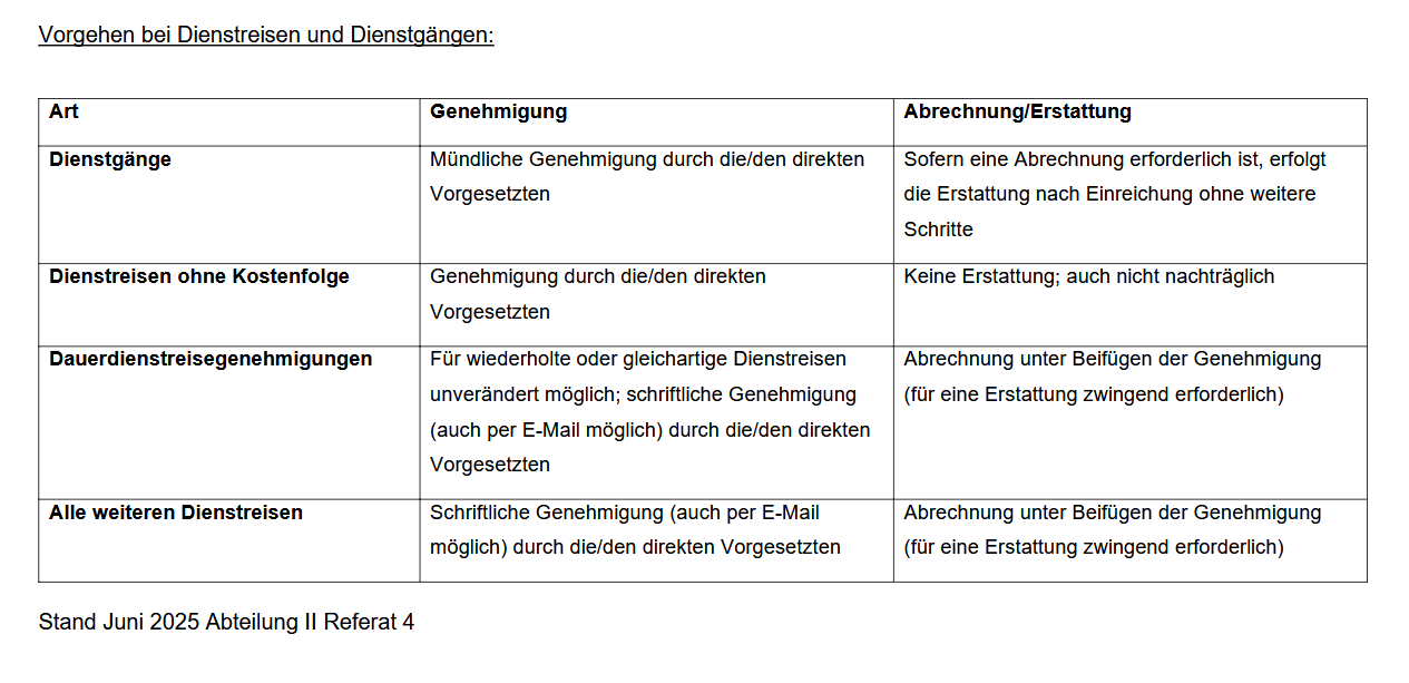 2) Den Antrag mit dem seit Juni 2025 zulässigen Verfahren stellen (i.d.R. per E-Mail), siehe auch Anlage Vorgehen bei Dienstreisen und Dienstgängen.pdf, Rundschreiben vom 27.6.2025 Änderung Genehmigungen an alle Dienstreisenden.pdf