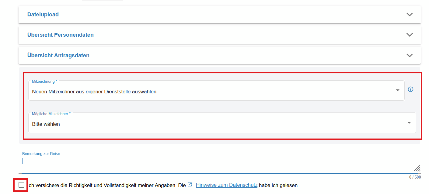Hinweis zur Mitzeichnung: In manchen Fällen kann es (nach vorheriger Absprache) Sinn machen, zunächst eine andere Person, z.B. im Sekretariat, als Mitzeichnung auszuwählen, die ggf. Korrekturen (z.B. Kostenstellen) vornimmt und dann ihrerseits den Antrag an den/die Vorgesetzte/n weiterleitet. Es können beliebig viele Personen zur Mitzeichnung zwischengeschaltet werden, jedoch muss am Ende der/die Vorgesetzte als Mitzeichnung ausgewählt werden und den Antrag genehmigen. Weitere Informationen zum Thema Mitzeichnen finden Sie hier: Mitzeichnen, Genehmigen und Vertreten |