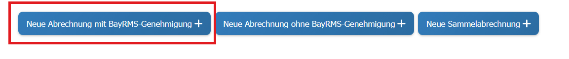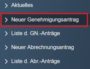 Wählen Sie in BayRMS links im Menü den Reiter "Neuer Genehmigungsantrag" und folgen Sie dann Schritt für Schritt der Anleitung, wie sie im folgenden Abschnitt beschrieben ist (Steps 1 bis 8 sind identisch zum Genehmigungsantrag): Neue Abrechnung ohne BayRMS-Genehmigung