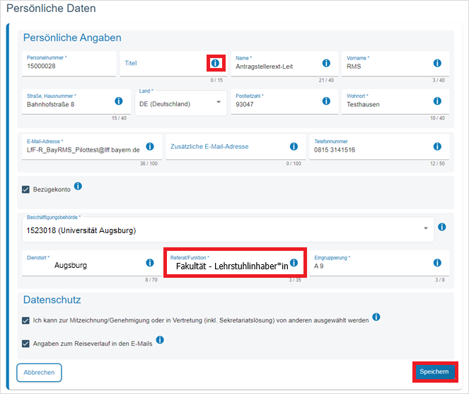 Bei erstmaliger Anmeldung werden Sie automatisch in den Abschnitt "Persönliche Daten" weitergeleitet. Pflichtfelder sind mit einem * markiert. Durch Klicken auf das i-Symbol erhalten Sie weitere Informationen zu den Eingabefeldern. Bitte ergänzen Sie Ihre persönlichen Daten, als Adresse tragen Sie bitte Ihre Wohnadresse ein. Im Feld "Beschäftigungsbehörde" wählen Sie aus dem Dropdown-Menü 1523018 (Universität Augsburg) aus. Im Feld "Dienstort" bitte den Dienstort laut Ihrem Arbeitsvertrag angeben. Im Feld "Referat/Funktion" tragen Sie Ihre Fakultät und den/die Lehrstuhlinhaber/in ein, z.B. "FAI - Prof. Mustermann". Wenn Sie in einer zentralen Einrichtung arbeiten, geben Sie bitte die übergeordnete Einheit an, z.B. "Bibliothek", "Rechenzentrum". Ausnahme Institut für Mathematik: Bitte befüllen Sie das Feld mit den Angaben "MNTF – Mathe – Lehrstuhlinhaber/in" Datenschutz: Standardmäßig sind die Haken für beide Punkte gesetzt, falls Sie dies nicht wünschen, lesen Sie bitte sorgfältig die Detailinformationen (i-Symbol) durch, bevor Sie die Haken entfernen. Wenn Sie auf "speichern" klicken, werden Ihre Angaben übernommen. | |