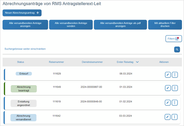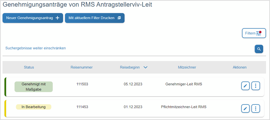 Klicken Sie auf die Schaltfläche hinter dem Namen der Person, für die Sie einen neuen Antrag erstellen oder bestehende Anträge einsehen möchten. Sie sehen nun die Liste bereits bestehender Anträge und haben folgende Möglichkeiten: