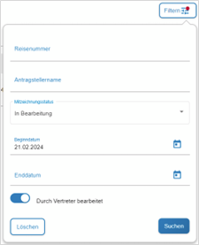 Um Anträge, die von Ihrer Vertretung bearbeitet wurden, einzusehen, können Sie im Menübereich „Antragsliste“ in der Filterfunktion die Option „Durch Vertreter bearbeitet“ auswählen: | |