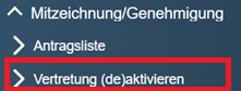 Wenn Sie eine Vertretung einsetzen möchten oder jemand anderen vertreten müssen, wählen Sie im Menübereich Mitzeichnung/Genehmigung den Unterpunkt „Vertretung (de)aktivieren“: