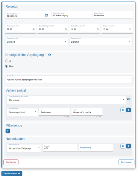 Über die Schaltfläche legen Sie die Daten des ersten Reisetags an. Füllen Sie die Eingabefelder entsprechend den Gegebenheiten ihrer Reise. Folgende Funktionen stehen Ihnen dabei zur Verfügung: