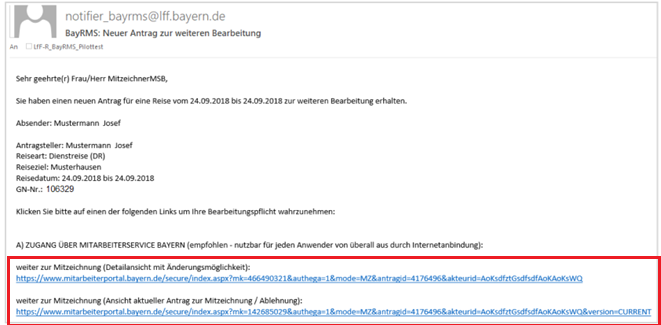 Als mitzeichnende Person erhalten Sie eine systemgenerierte Benachrichtigungsmail, sobald ein Antrag einging, der Ihnen von einer antragstellenden Person zur Mitzeichnung zugewiesen wurde. In der Benachrichtigungsmail sind zwei Links enthalten, der Sie zum jeweiligen Antrag in BayRMS führen. → Über den 1. Link können Sie Änderungen im Antrag vornehmen. → Über den 2. Link bekommen Sie einen Gesamtüberblick über die beantragte Reise. |