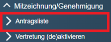 | Wählen Sie hierzu im Menü Mitzeichnung/Genehmigung den Punkt „Antragsliste“ aus. | |