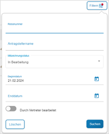 Stellen Sie ggf. die Filterkriterien entsprechend ein. Häufig führt z.B. der hinterlegte Datumsfilter dazu, dass Anträge nicht angezeigt werden. Wie Sie den hinterlegten Datumsfilter dauerhaft ändern können, erfahren Sie in der Rubrik Voreinstellungen. | |