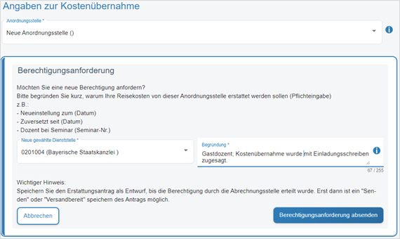 Sollten Sie Reisekosten bei einer anderen Behörde abrechnen wollen, müssen Sie im Step 8 (Buchungsdaten) einmalig die nötige Berechtigung bei der betreffenden Abrechnungsstelle beantragen.