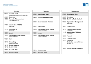 A shuttle as well as on-site accommodation and meals are provided by TUM-GS. Please note that departure and arrival times vary depending on what day you leave for Raitenhaslach! There is a group leaving on Monday and one leaving on Wednesday: