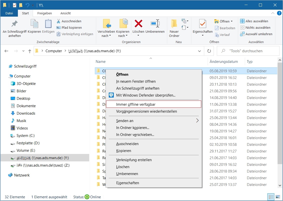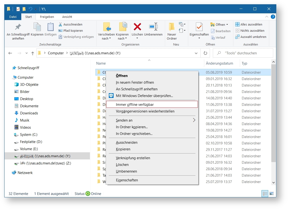 - Nun können die Offlinedateienordner oder dessen Unterordner im Kontextmenü "Immer offline verfügbar" ausgewählt werden.