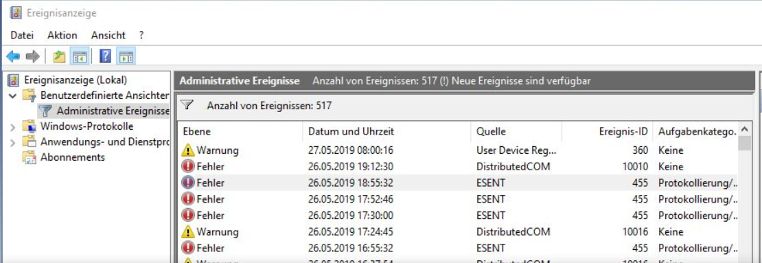 Die EDB.log und weitere Protokolldateien können nun automatisch angelegt werden und die Ereignisanzeige bleibt von einer Fehlermeldung verschont.