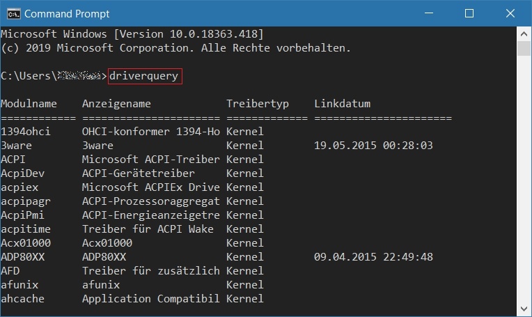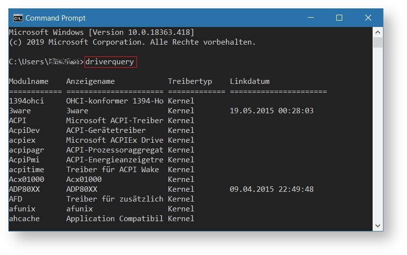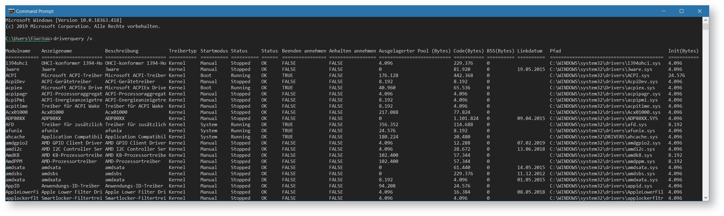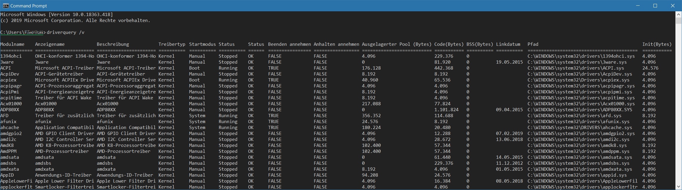 Es gibt einen Befehl bei den Windows Systemen, um sich alle vorhandenen Informationen über die installierten Treiber anzeigen zu lassen.