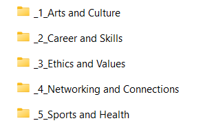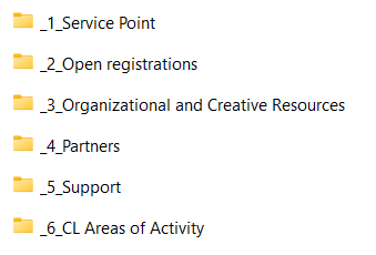 Ein Ordner ist für den Servicepoint vorgesehen. Die weiteren Ordner orientieren sich an der Kategorisierung wie die Events auch nach außen beworben werden: Sports & Health, Career & Skills etc. und beginnen mit Zahlen, damit sie in alphabetischer Sortierung oben erscheinen.